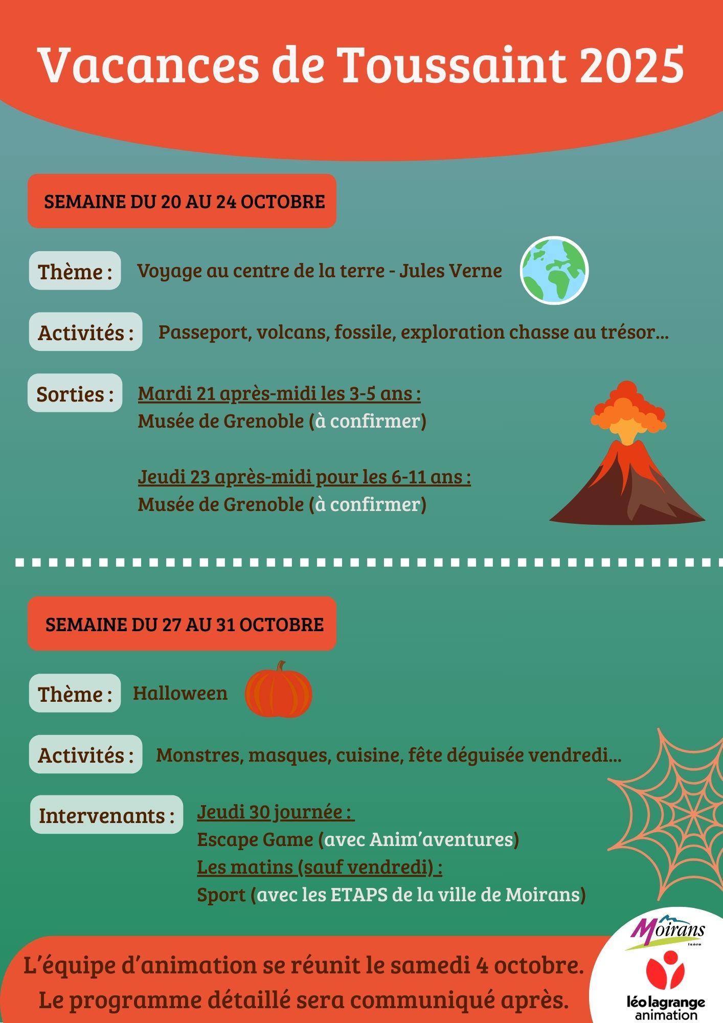Le programme détaillé n’est pas encore connu, car l’équipe d’animation se réunit le samedi 11 octobre pour préparer les vacances.