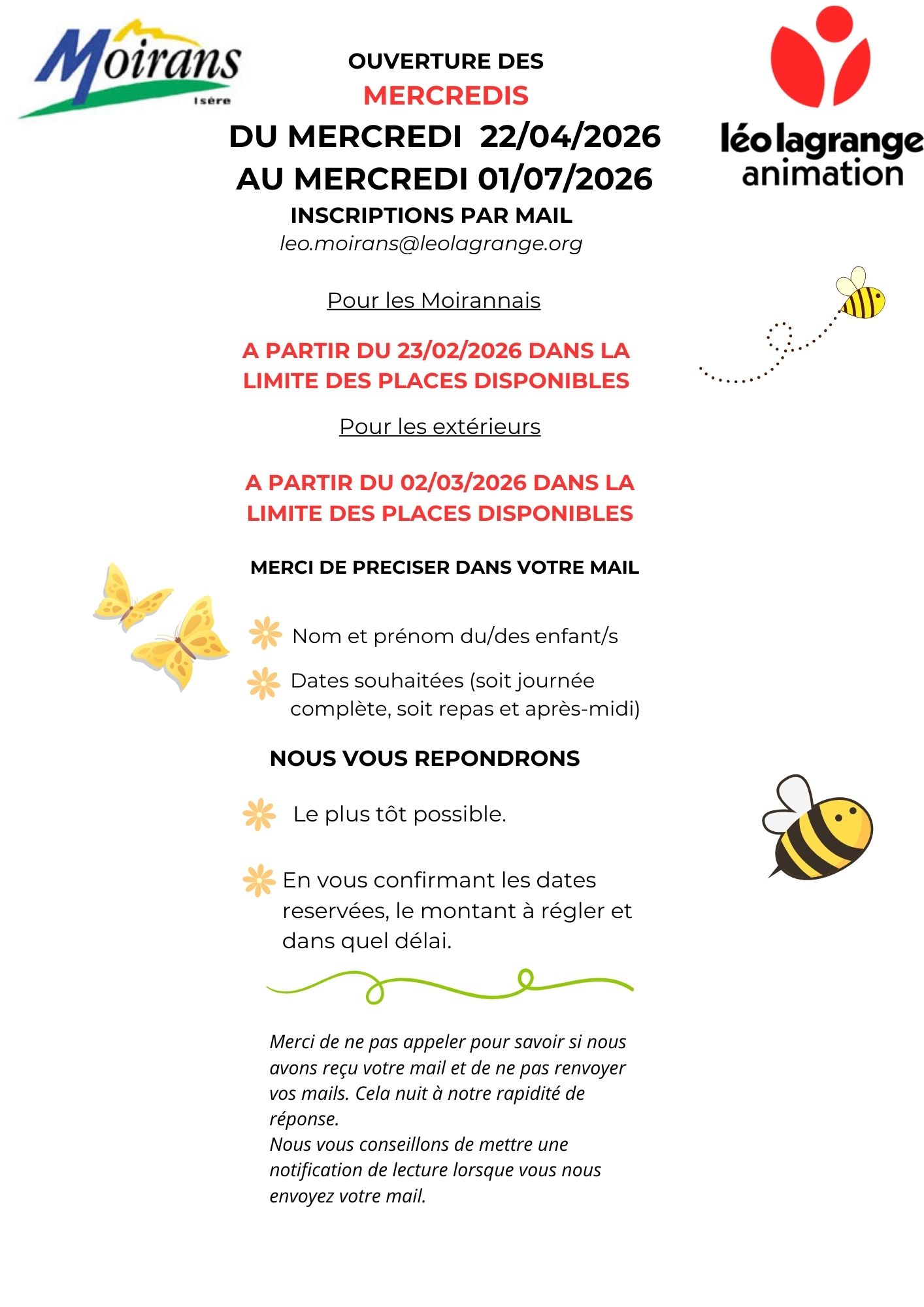 Ouverture des inscriptions pour les mercredis du 22 avril au 01 juillet 2026 Publication publiée :17 février 2026 Post category:Actualités